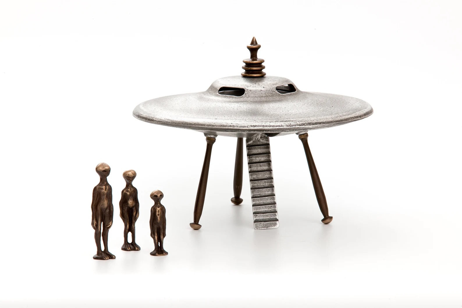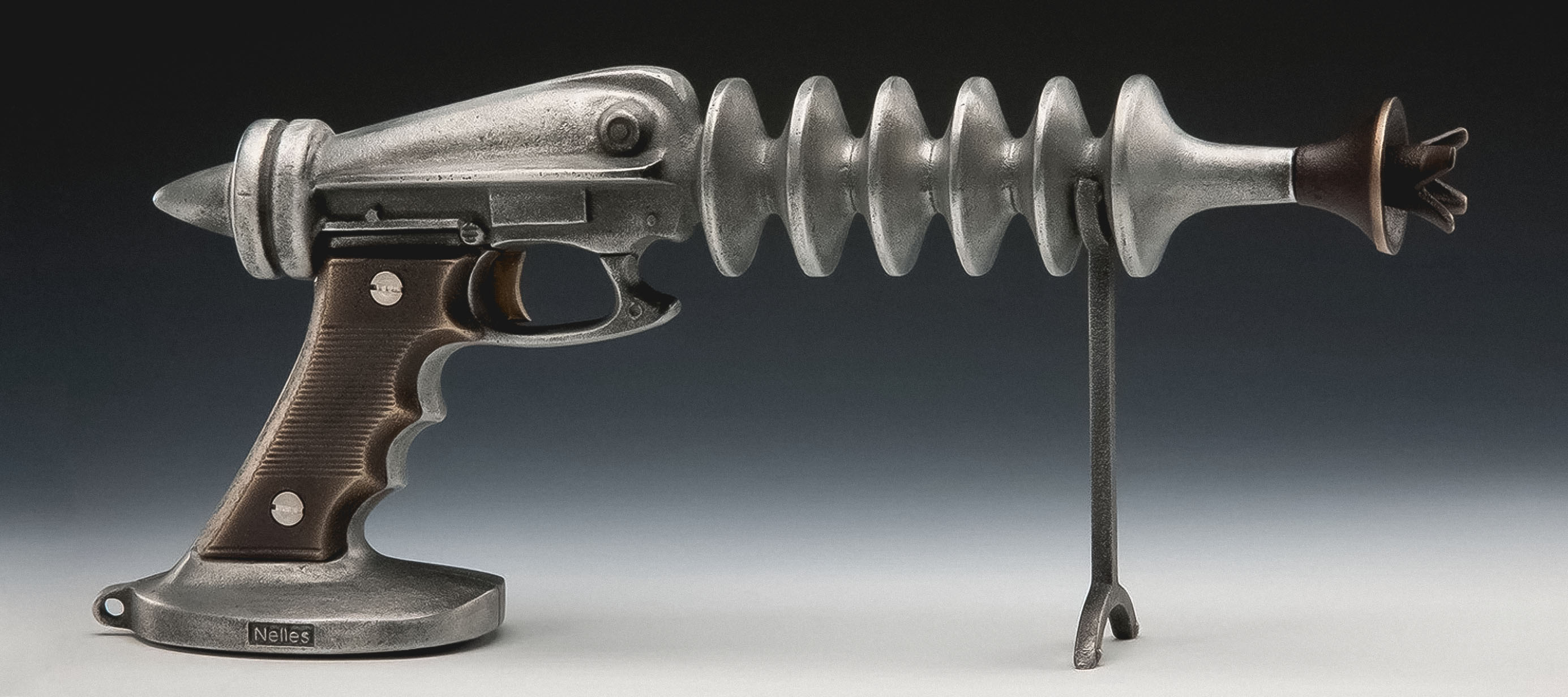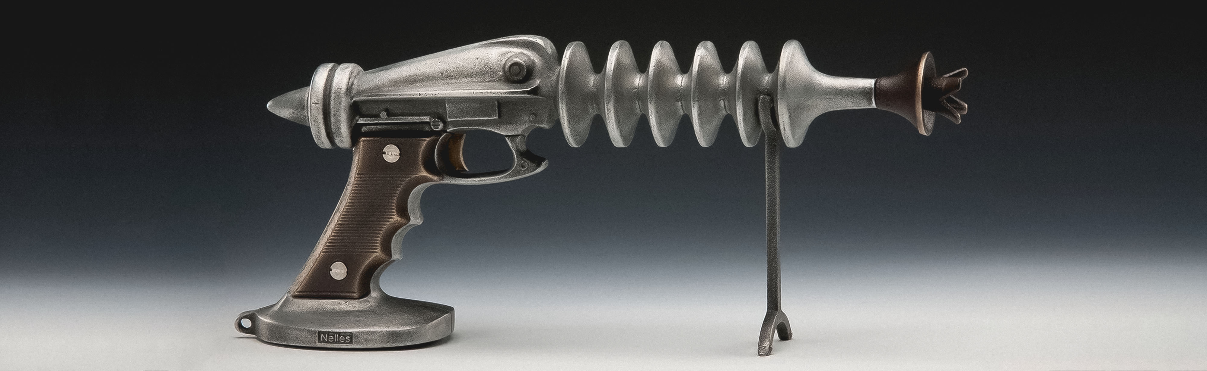 Cast metal toy rockets, ray guns, and flying saucers take him back to his childhood in Detroit where his father, a manufacturers representative, would take Scott on factory tours. The dramatic sight and heat of molten metal became a part of his soul and the excitement of the foundry process has never left him.