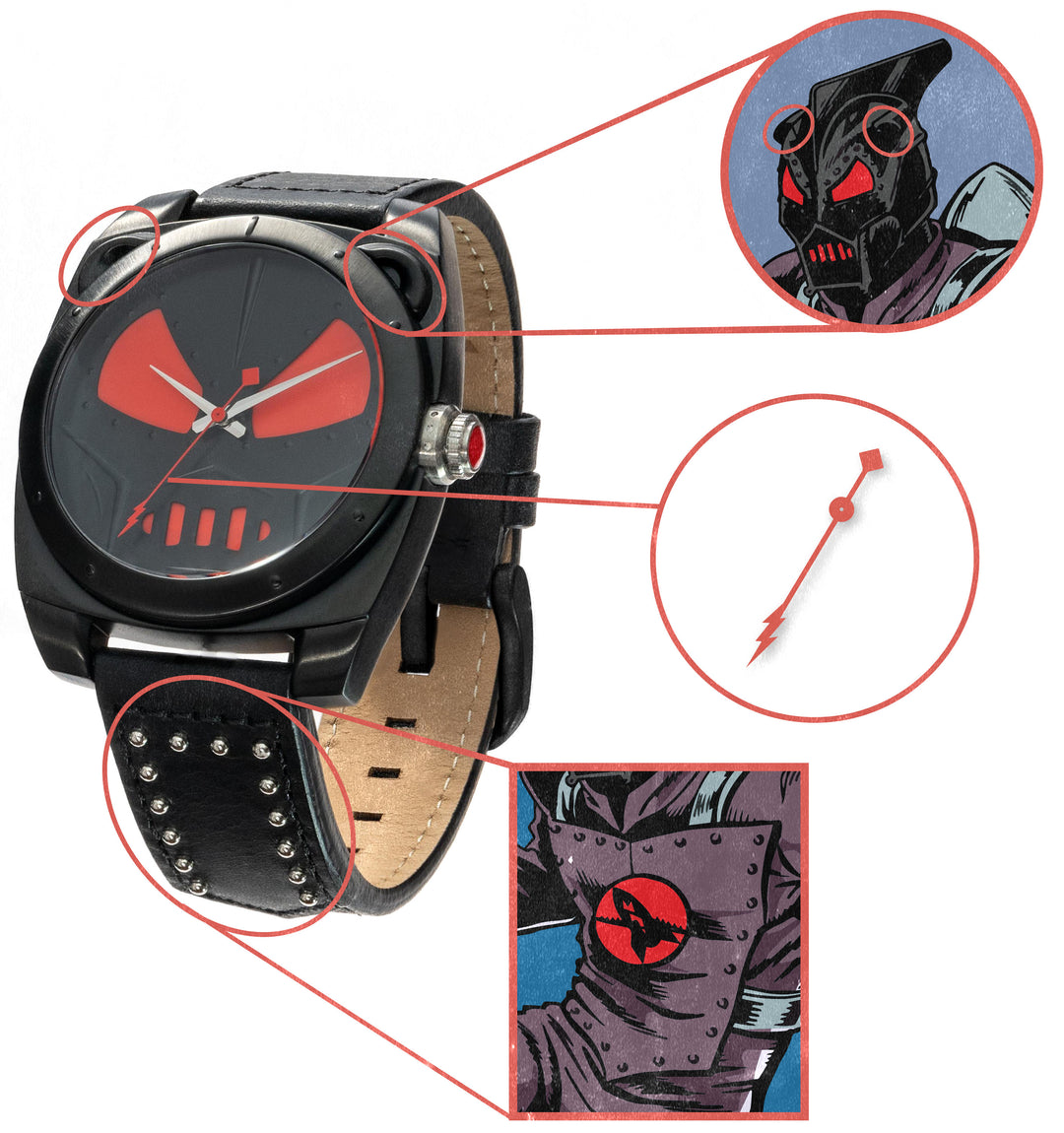 • The genuine leather band becomes The Black Phantom's jacket, complete with silver buttons!