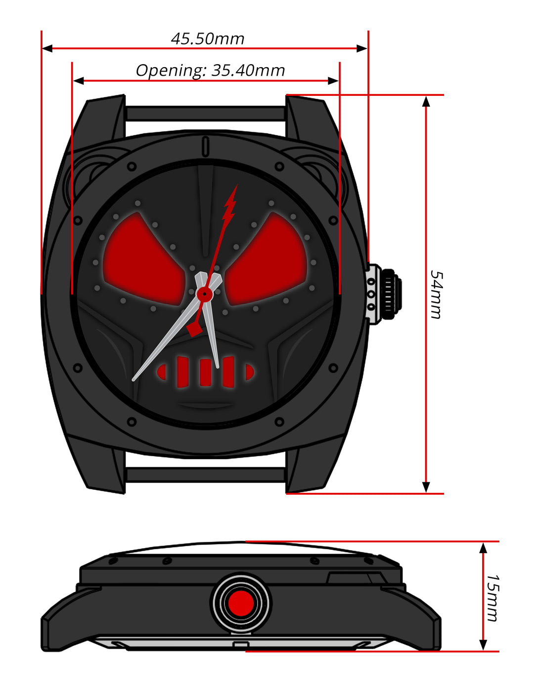 • Custom red lightning bolt second hand only available on this version of the watch!
