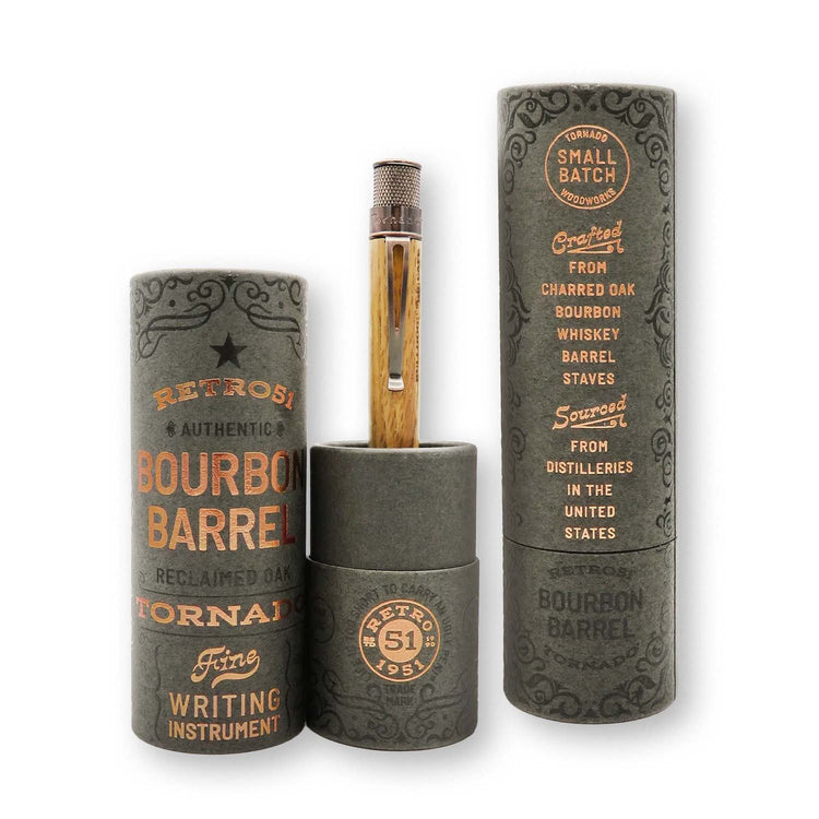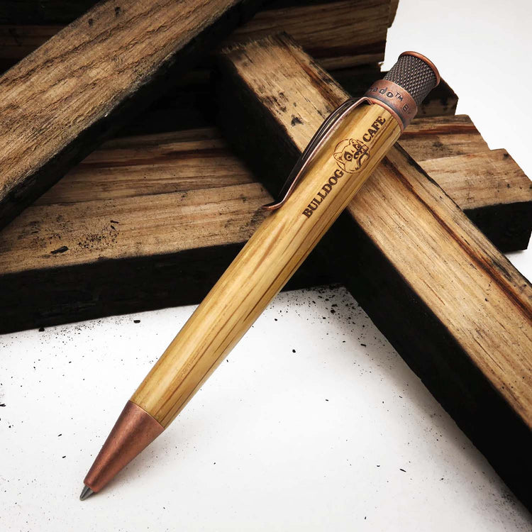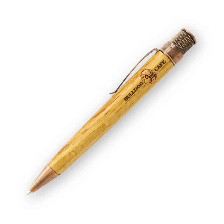 Each pen is turned from real charred oak barrel staves that once housed bourbon whiskey (the good stuff), complete with stonewashed copper trim accents and a burned-in Bulldog Cafe logo from The Rocketeer. Comes packed in a copper foil accented tube and preloaded with black ink—ready for schematics, diner orders, or last-minute flight plans.