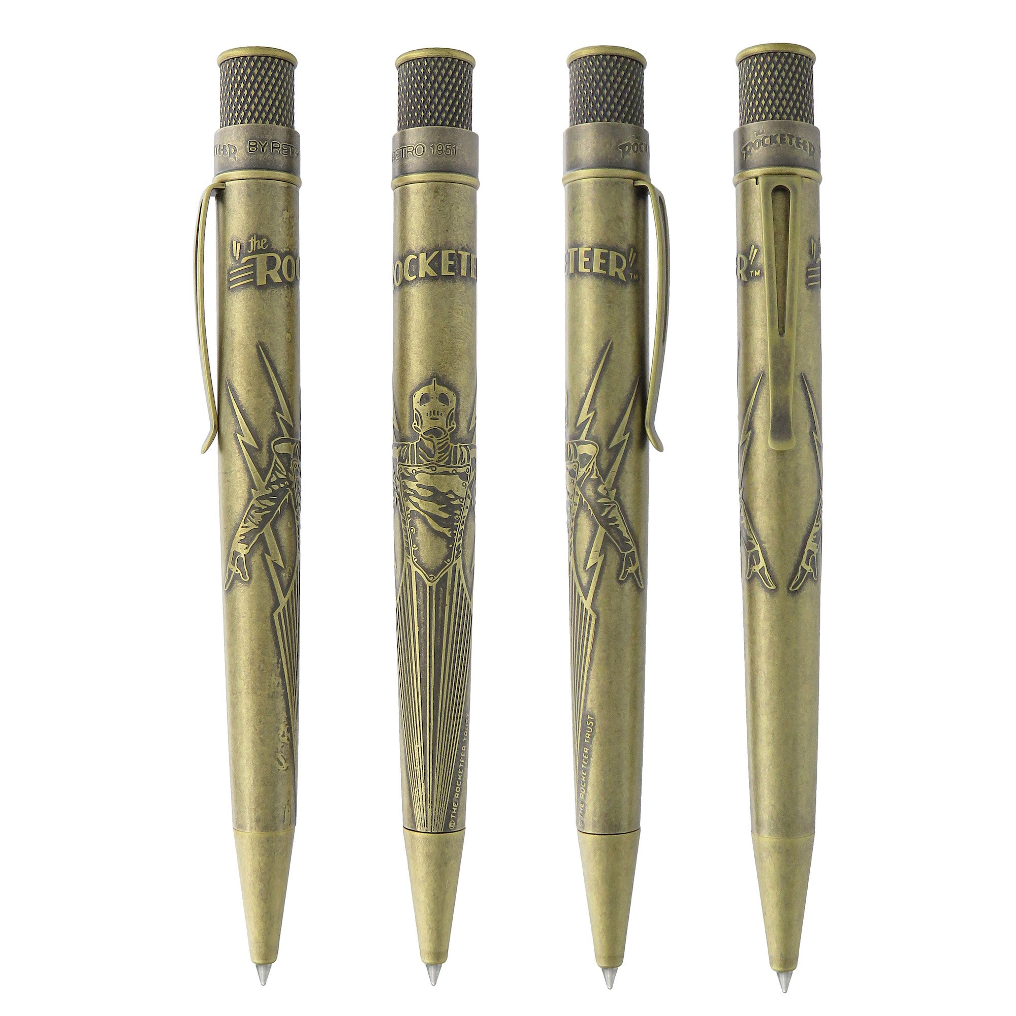 Taken directly from the cover of The Rocketeer Adventure Magazine #1, this beautiful stonewashed brass rollerball pen features an acid-etched image of The Rocketeer blasting off on the barrel! The character is framed by four lightning bolts with the classic logo above. The top disc features The Rocketeer’s face from his iconic helmet. Each pen is numbered on the top ring and packaged in a graphic tube featuring a collage of pages straight from the comic book!