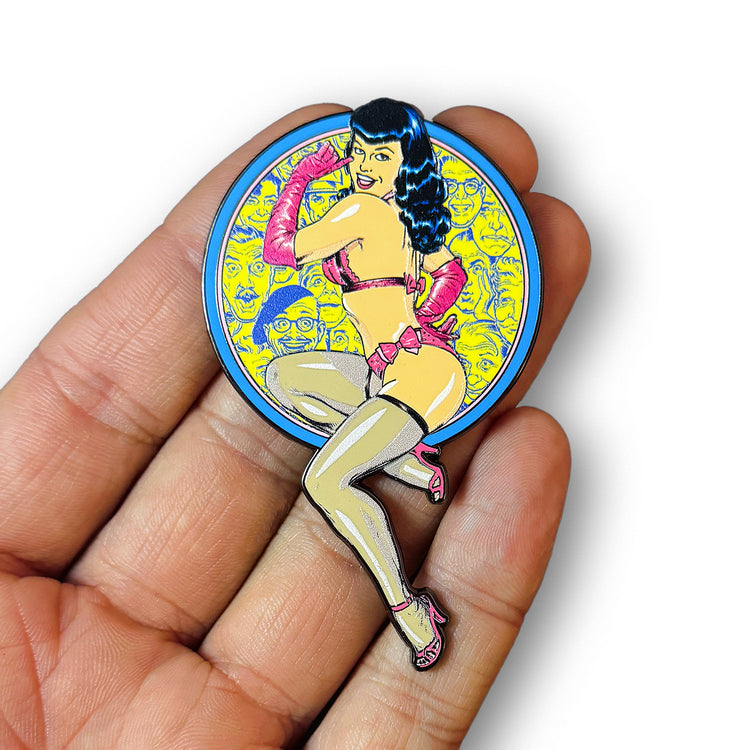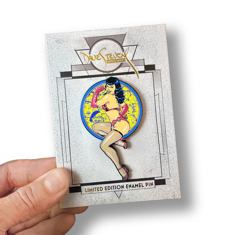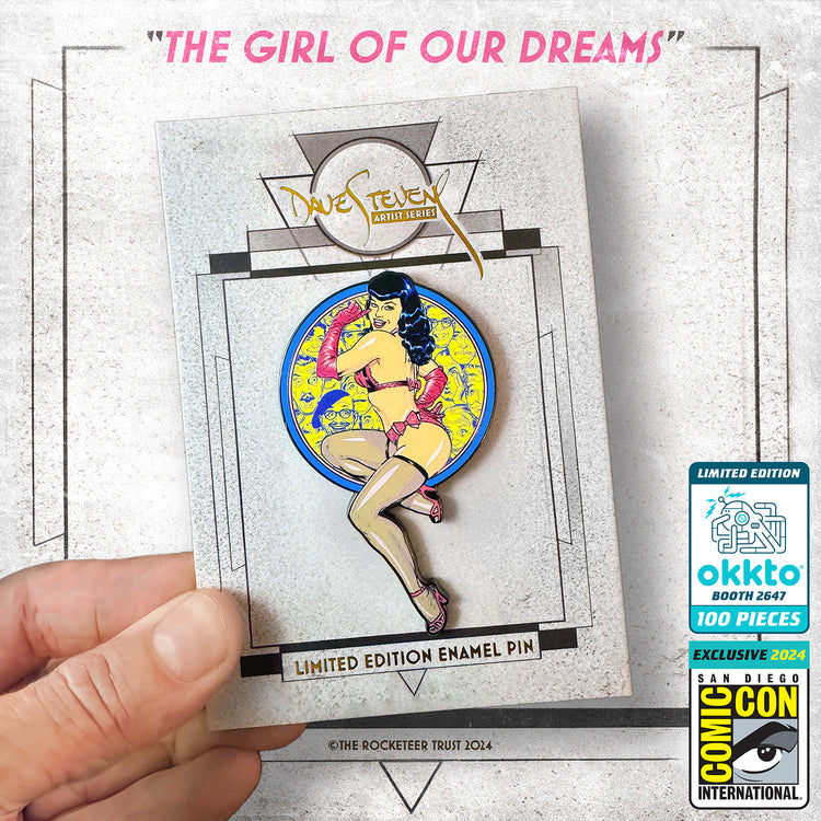 Introducing “The Girl of Our Dreams” Enamel Pin a faithful recreation of Dave Stevens's famous piece of art inspired by pinup icon Bettie Page. This is our San Diego Comic-Con exclusive edition, featuring color enamel, black nickel metal, UV printed details, and a deluxe oversized backing card with gold foil.