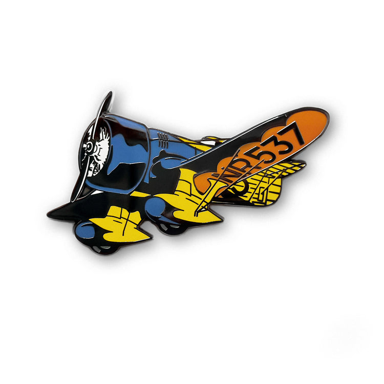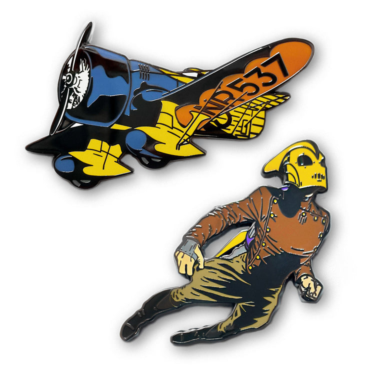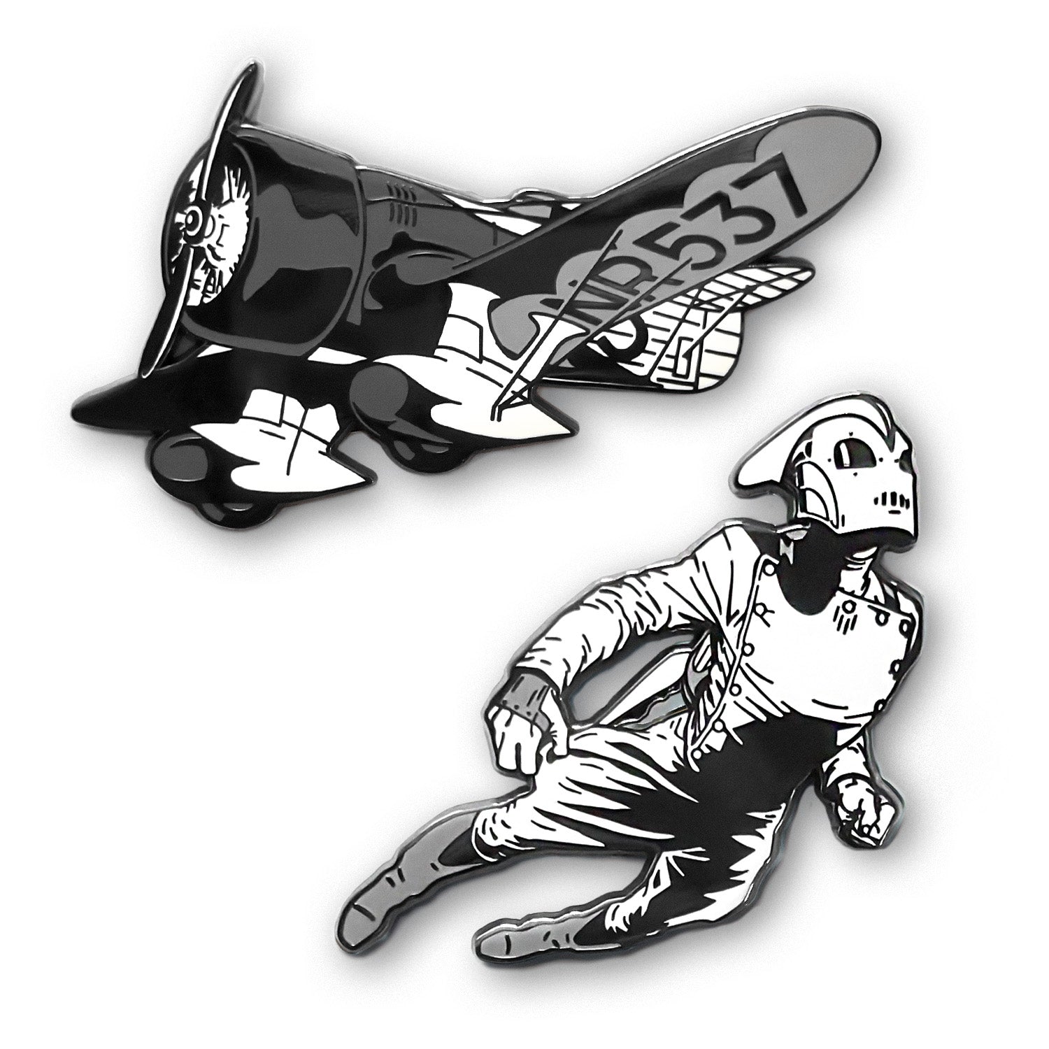 This officially licensed two-pin set features Dave Stevens’s original artwork from The Rocketeer in stunning detail. The set includes The Rocketeer “First Flight” and “The Blind Bulldog,” Cliff Secord’s infamous Gee Bee racer.