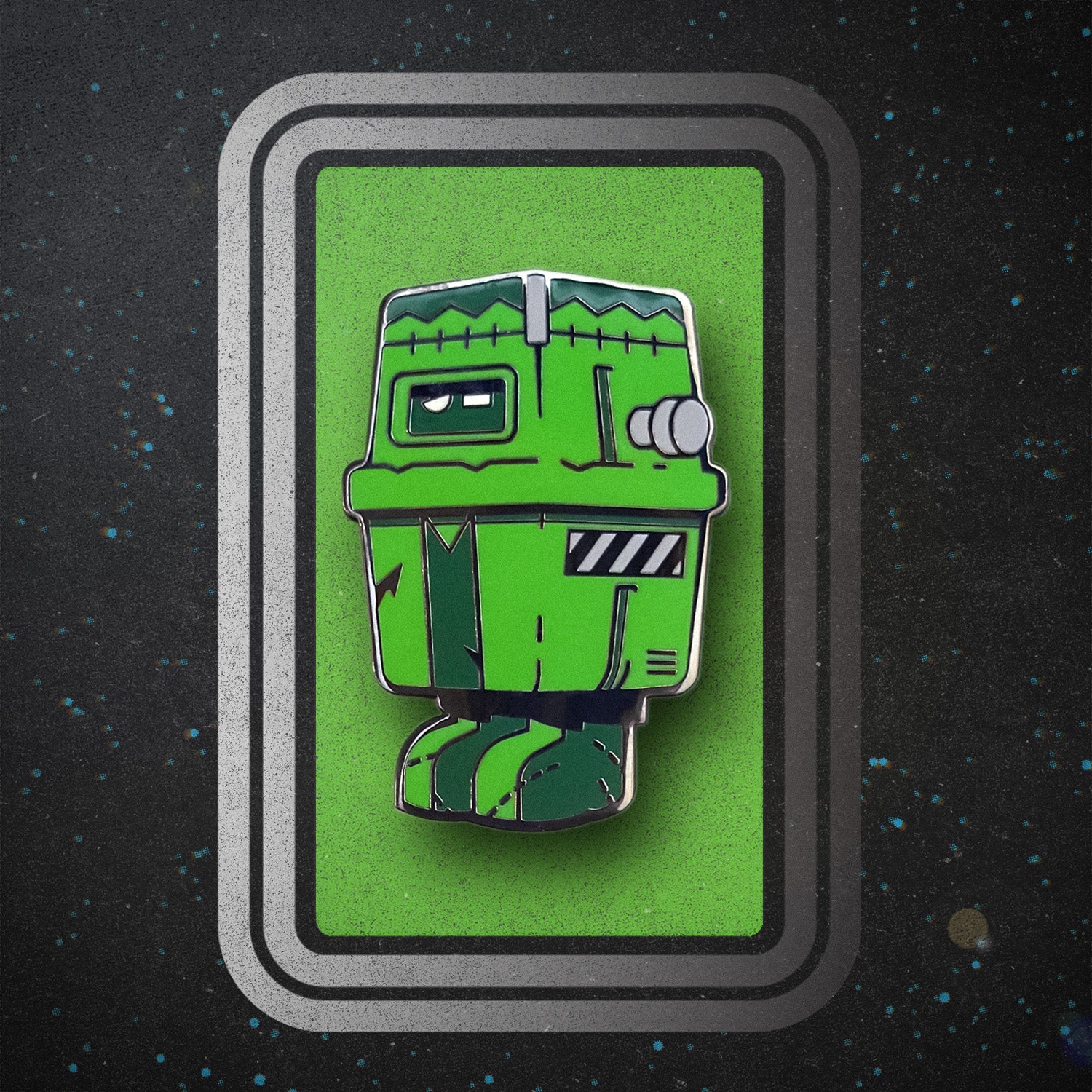 Unleash the monstrous charm of Frankengonk! This enamel pin combines the blocky, lovable Gonk droid with the iconic look of Frankenstein's creature—bolts, stitches, and all. Featuring glowing eyes and a sickly green hue, Frankengonk is perfect for sci-fi and horror fans alike. Made with durable hard enamel with a secure backing, this pin is the ultimate accessory to electrify your jacket, bag, or lanyard. At approximately 1.6", Frankengonk is ready to bring your collection to life! Comes pinned to a retro-styled backing card with silver foil accents.