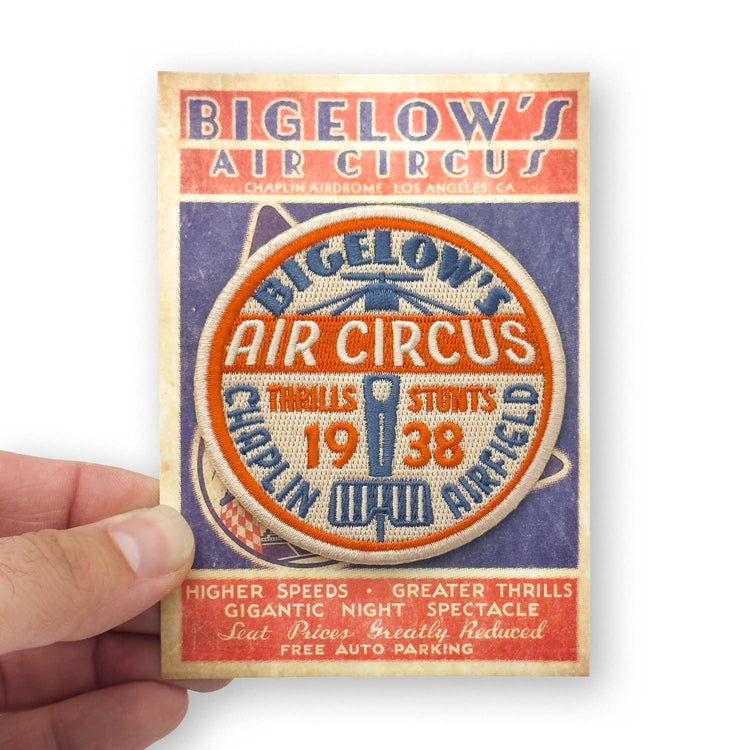 Measuring 3 inches across and embroidered in three bold colors, each patch includes an iron-on backing—so you can affix it onto your flight jacket, work shirt, or bag. Comes packed on a custom-printed poster card, perfect to remember your trip to Bigelow's Air Circus. Pick one up today!