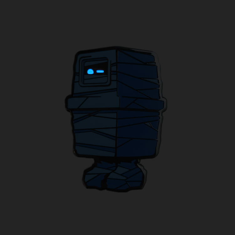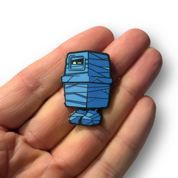 Mumm-E Gonk is a delightfully spooky mashup of a classic Gonk droid and an ancient mummy! Wrapped in weathered bandages and glowing eyes, this 1.6" hard enamel pin adds just the right touch of undead charm to your jacket, bag, or display board. Comes on a retro silver-foil backing card.