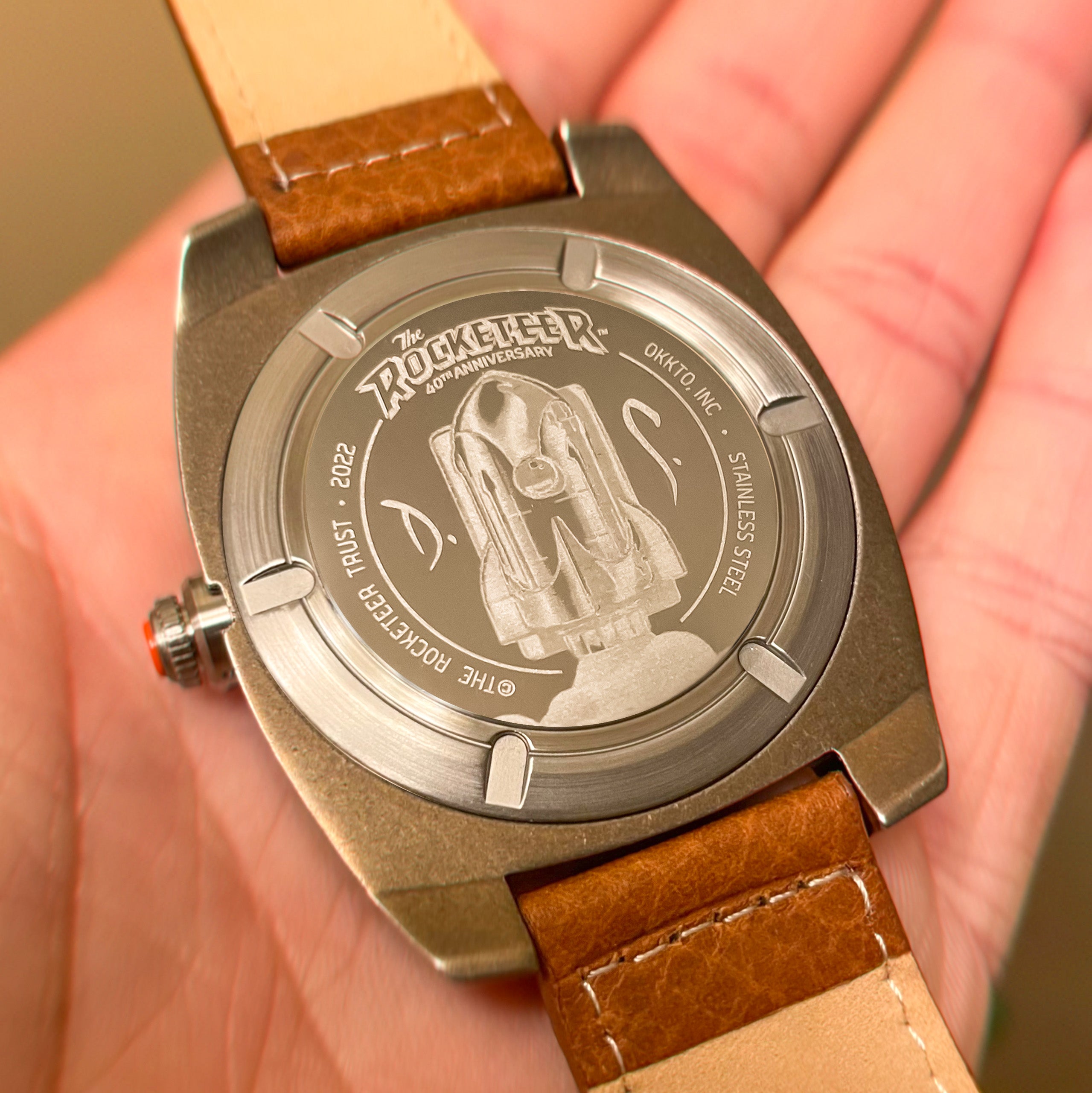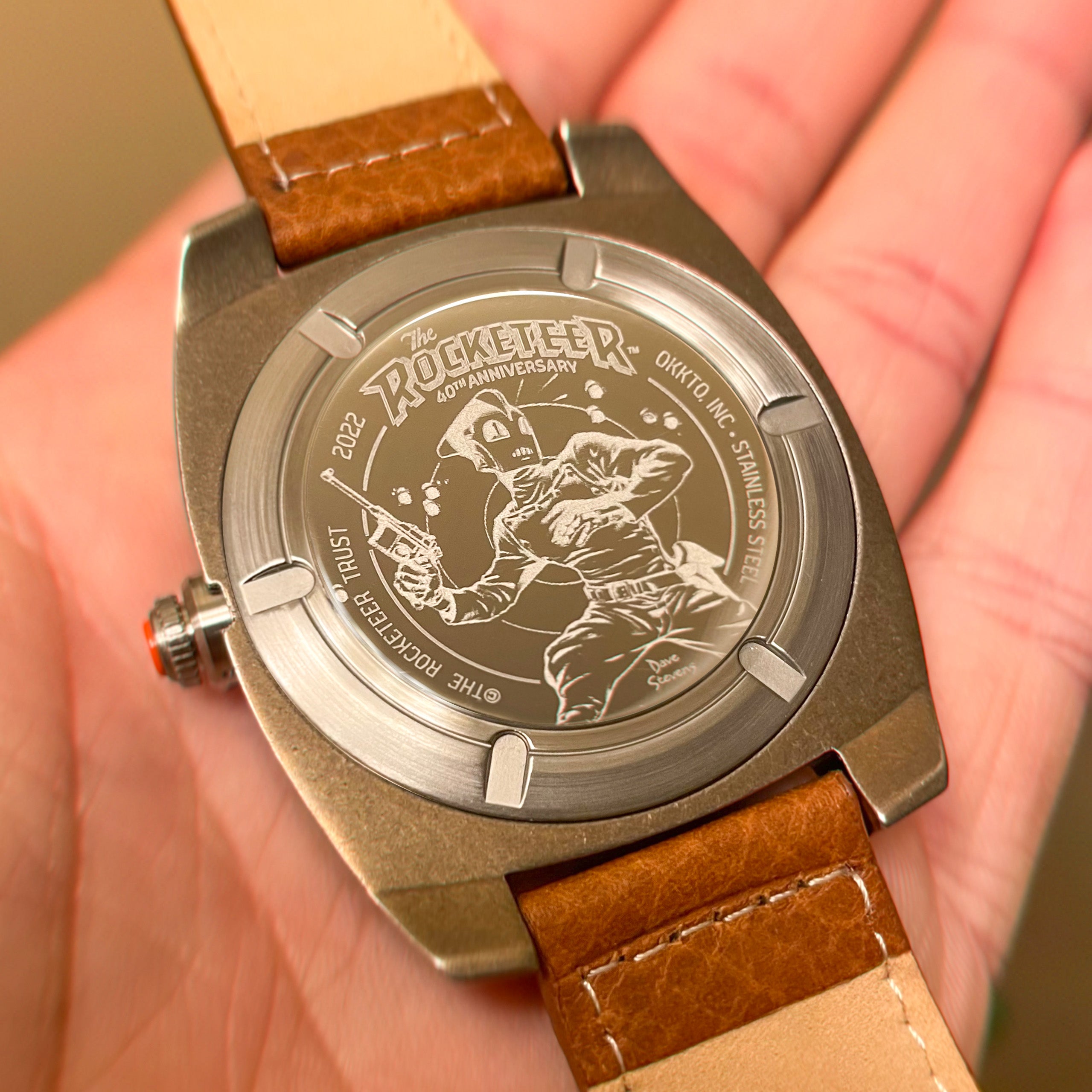 This watch was lovingly designed in-house at Okkto to honor the legacy and high flying adventures of Dave Stevens’ The Rocketeer!