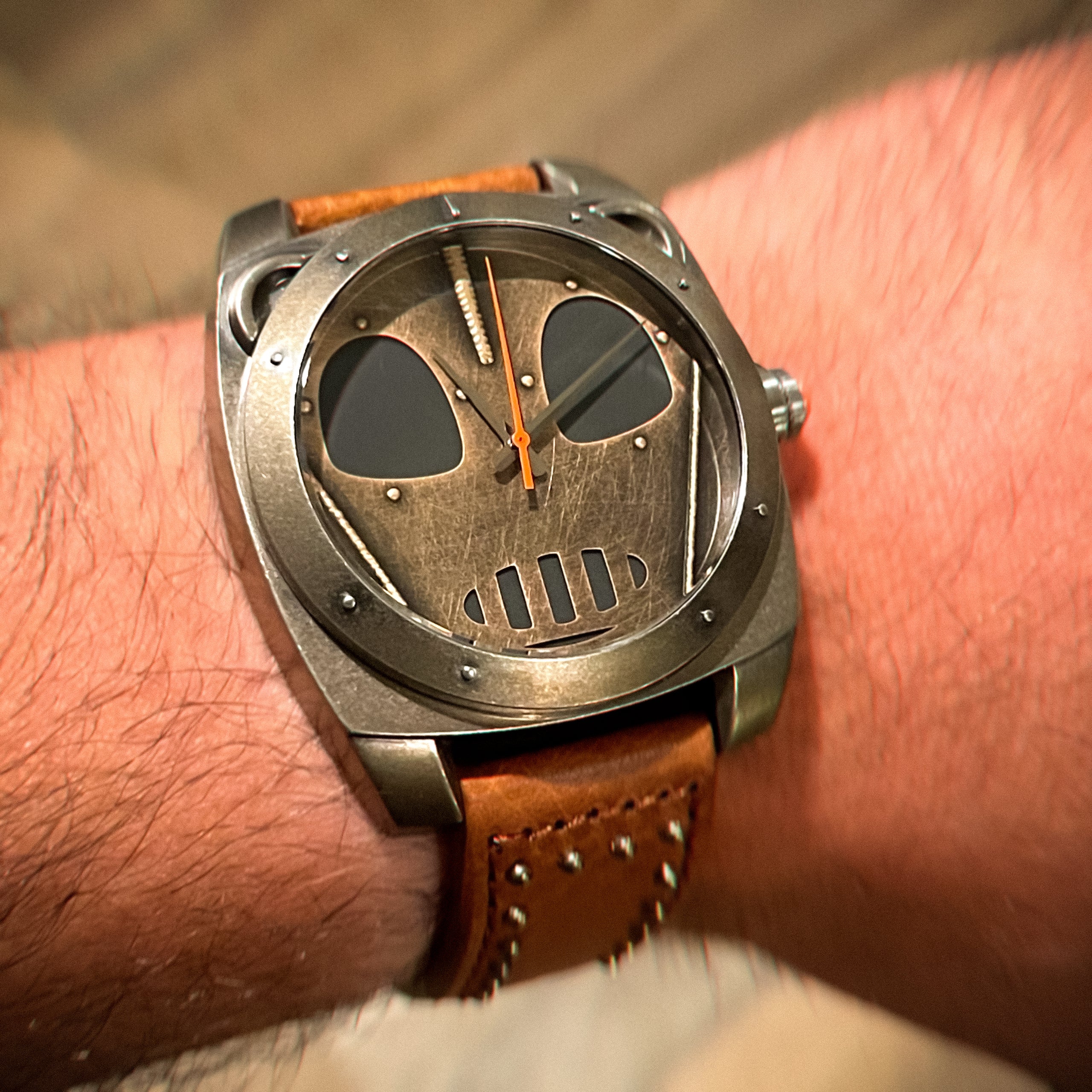 • The helmet forms the central design element with the face and bezel, including the grill, eyes, rivets, and even air intakes!